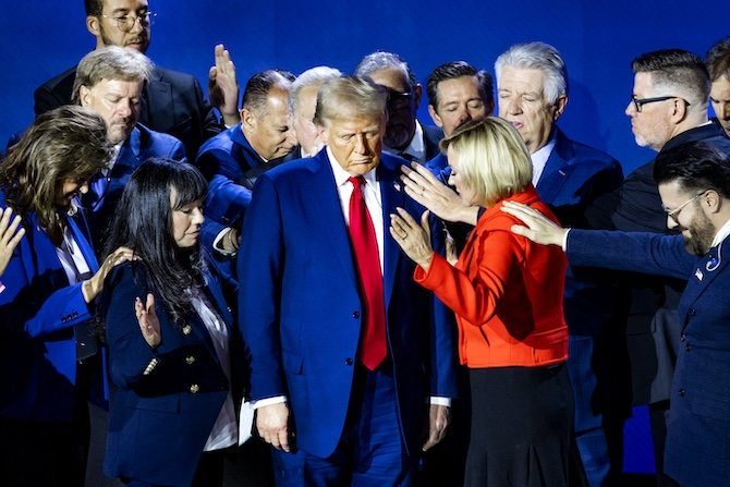 Entouré de pasteurs et de prédicateurs évangéliques, dont sa conseillère spirituelle Paula White, le président n’hésite pas à mêler prière et pouvoir, au risque de brouiller la ligne de séparation entre l’Église et l’État.