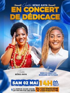 Le monde chrétien ivoirien s’apprête à vivre un intense moment de louange et d’adoration. L’artiste-chantre Bénie Akpa donnera un concert de dédicace le samedi 2 mai, à partir de 14h, à Cocody-Angré, à l’Espace Aggée (Les Oscars, rue des Bars).