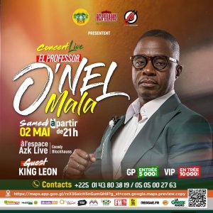 Le Chantre Léon vous convie au concert live d’O’nel Mala, le 2 mai prochain, à Cocody, Blockhaus, à partir de 21h, à l’Espace AZK Live.