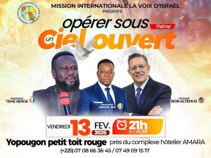 La Mission Internationale La Voix d’Israël vous invité à une grande veillée de prière autour du thème « Opérer sous un ciel ouvert ». Elle est prévu pour le vendredi 13 février 2026, de 21 heures jusqu’à l’aube.