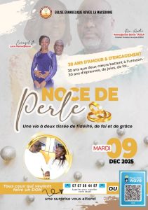 La célébration officielle est donc prévue pour le mardi 09 décembre 2025 et promet un temps de reconnaissance et de louange. Ainsi, par cette annonce, l’Église Évangélique Réveil La Macédoine veut honorer ses fondateurs et rappeler aussi le lien intime entre leur vie personnelle, leur témoignage de longévité et la pérennité de leur mission pastorale collective.