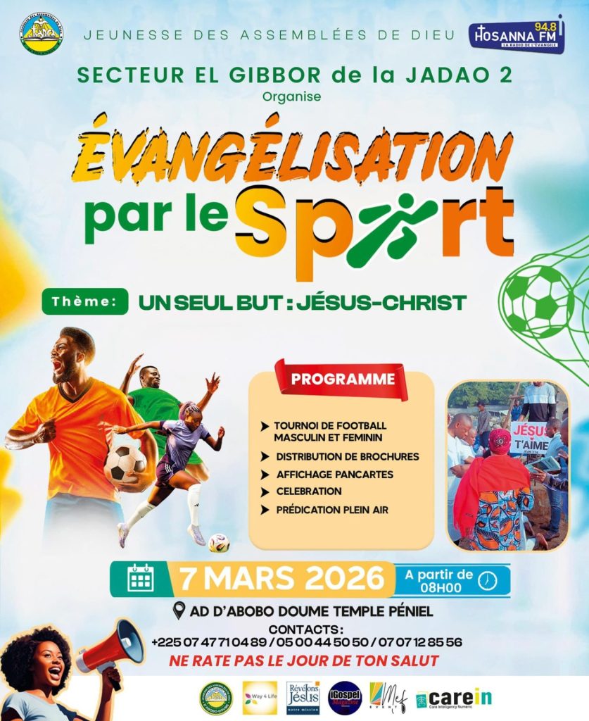Évangélisation par le sport : La Jeunesse des Assemblées de Dieu du Secteur « El Gibbor » de la JADAO 2, en collaboration avec Hosanna FM (94.8 MHz), organise une grande manifestation sportive et d’évangélisation autour du thème : « Un seul but : Jésus-Christ ».